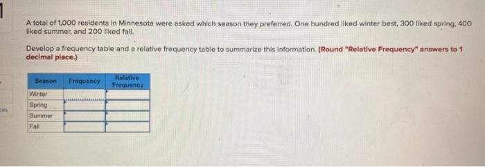 A total of 1000 residents in Minnesota were asked which season they preferred. Develop a frequency table and a relative frequency table to summarize this information.